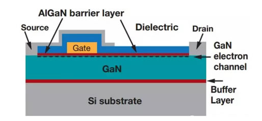 Figure 2 shows the basic structure of a GaN transistor. From the previous discussion, we can know that the GaN material is located on the Si substrate. The advantage of this design is that it can not only make full use of the advantages of decades of Si processing, but also take advantage of the advantages of the new material GaN. One of the advantages is that it can achieve higher Band gap voltage.